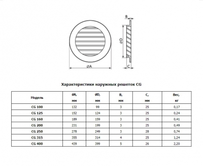 Наружные решётки CG предназначены для забора свежего воздуха и удаления загрязнённого воздуха из зданий. Решётки CG представляют собой круглую раму с установленными в неё неподвижными жалюзи, форма которых препятствует проникновению атмосферных осадков с улицы. С внутренней стороны решетки установлена защитная сетка.