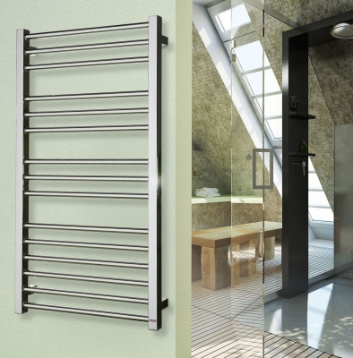 Полотенцесушитель из полированной нержавеющей стали.